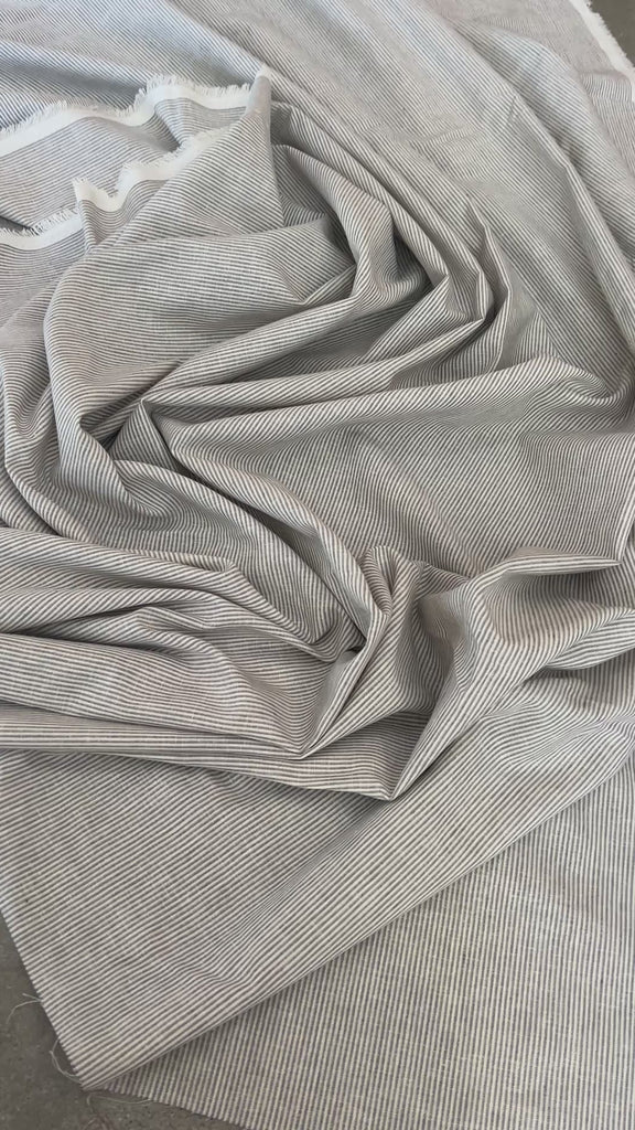 Elki is a drapey vertical stripe that feels durable and sturdy. It has a slight rough feel that most unwashed linens do - overtime this will soften. It is not sheer and perfect for most garments. It has no stretch.