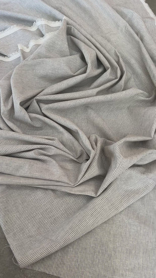 This colourway has a warm cream background with a silvery, grey stripe approximately 1.5mm wide repeating the length of the material. The grey stripes are crossed with the cream colour giving the stripe some added texture.
