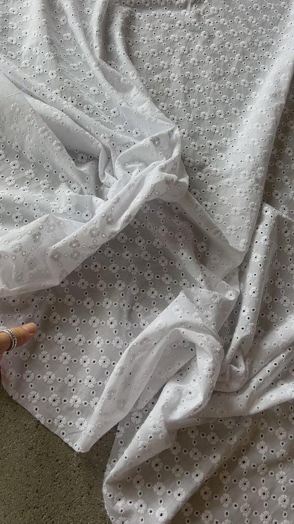 This fabric is crafted from light to mid-weight cotton, offering a breathable and comfortable feel. It drapes beautifully while maintaining gentle structure, enhanced by the textured embroidery throughout. The embroidered detailing adds dimension and subtle body to the fabric, creating a balanced combination of softness and form. Ideal for garments that require both movement and shape.